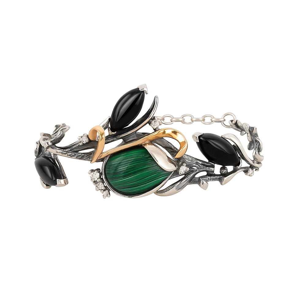 - Вставки: золотая накладка, кубический цирконий, малахит, оникс, Со вставками