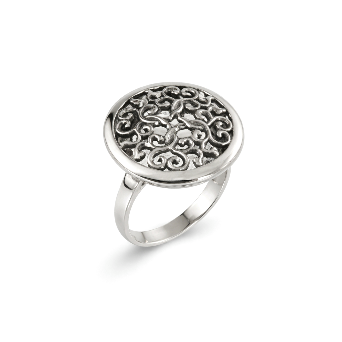 Серебряное кольцо Сирия — изысканное украшение с ажурным орнаментом, создающим эффект лёгкости и глубины. Круглая форма и витиеватый узор придают изделию утончённость и выразительный характер. Подойдёт для женщин, которые ценят элегантные украшения с художественным дизайном и необычной фактурой. Идеально для повседневной носки, деловых образов, а также для встреч, свиданий и особых случаев, когда хочется добавить образу изящный акцент.