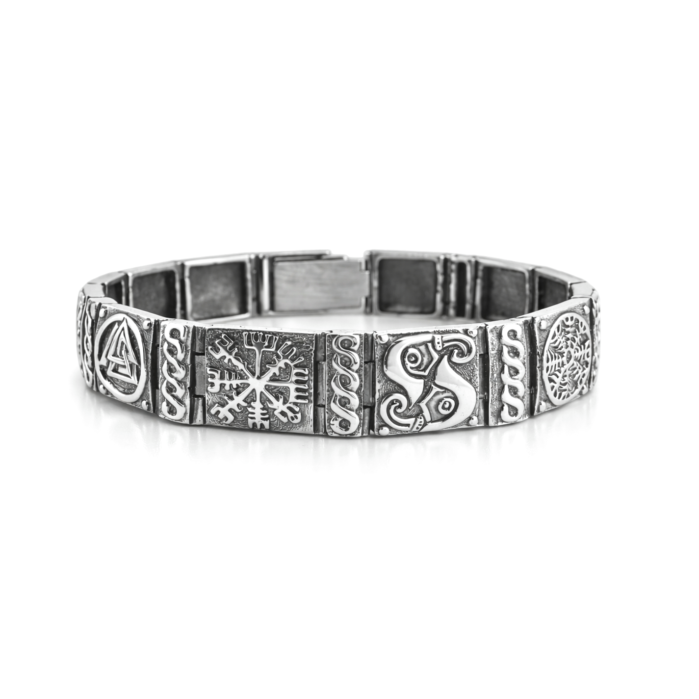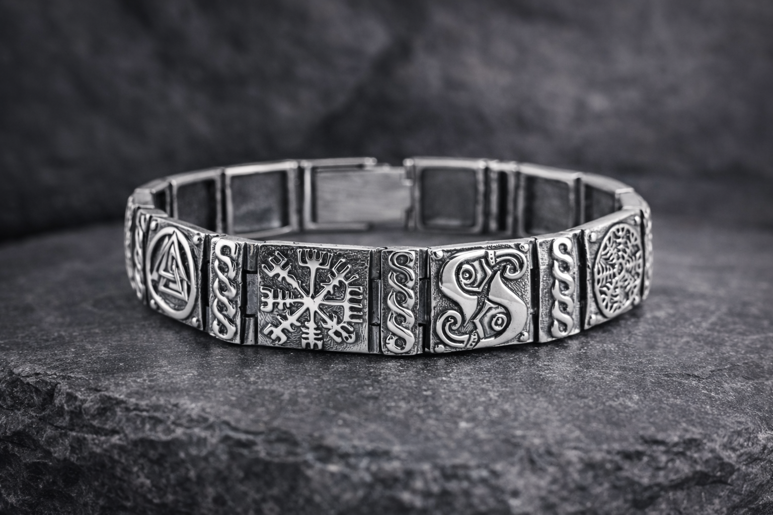 Серебряный браслет Руны выполнен в виде массивных звеньев, украшенных древними символами и орнаментами. Контраст полированного серебра и чернёного фона подчёркивает глубину рельефа и придаёт украшению выразительный характер. Браслет выглядит уверенно и статусно, подчёркивая индивидуальный стиль владельца.