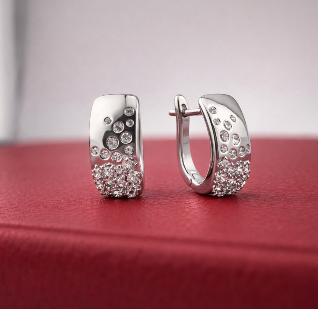 Серебряные серьги Россыпь фианитов — выразительное украшение с эффектным сиянием и современным характером. Декоративная композиция из фианитов разного размера создаёт эффект динамики и объёма, красиво отражая свет и привлекая внимание к деталям.