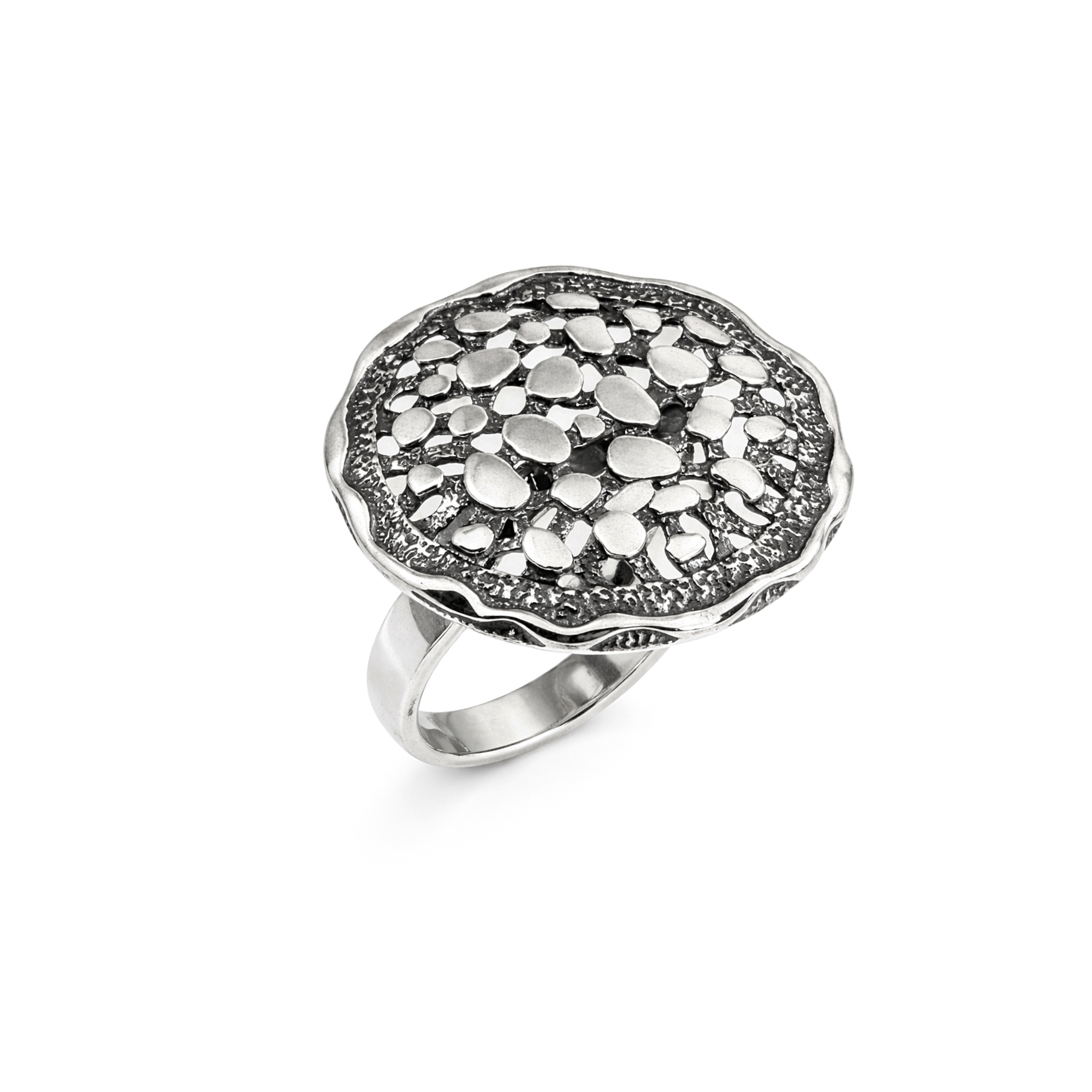 Срібна каблучка Талісман — ефектна прикраса з ажурним дизайном, що нагадує природні форми і створює відчуття легкості та глибини. Об’ємна фактура і незвичайна форма роблять обручку виразним акцентом в образі. Підійде дівчатам та жінкам, які люблять оригінальні та стильні прикраси, і стане чудовим вибором як для повсякденного носіння, так і для особливих випадків – зустрічей, свят чи яскравих виходів.