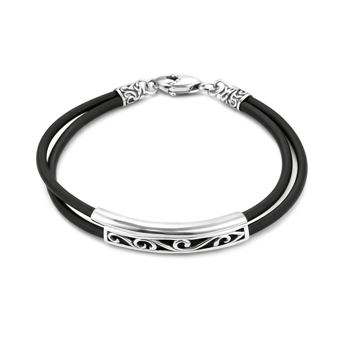Срібний каучуковий браслет Еріка – стильне поєднання мінімалізму та виразних деталей. Контраст чорного каучуку та срібного елемента створює сучасний акцент, який легко вписується у будь-який образ. Підійде для повсякденного носіння і стане універсальною прикрасою як для базових, так і більш зібраних цибулів.