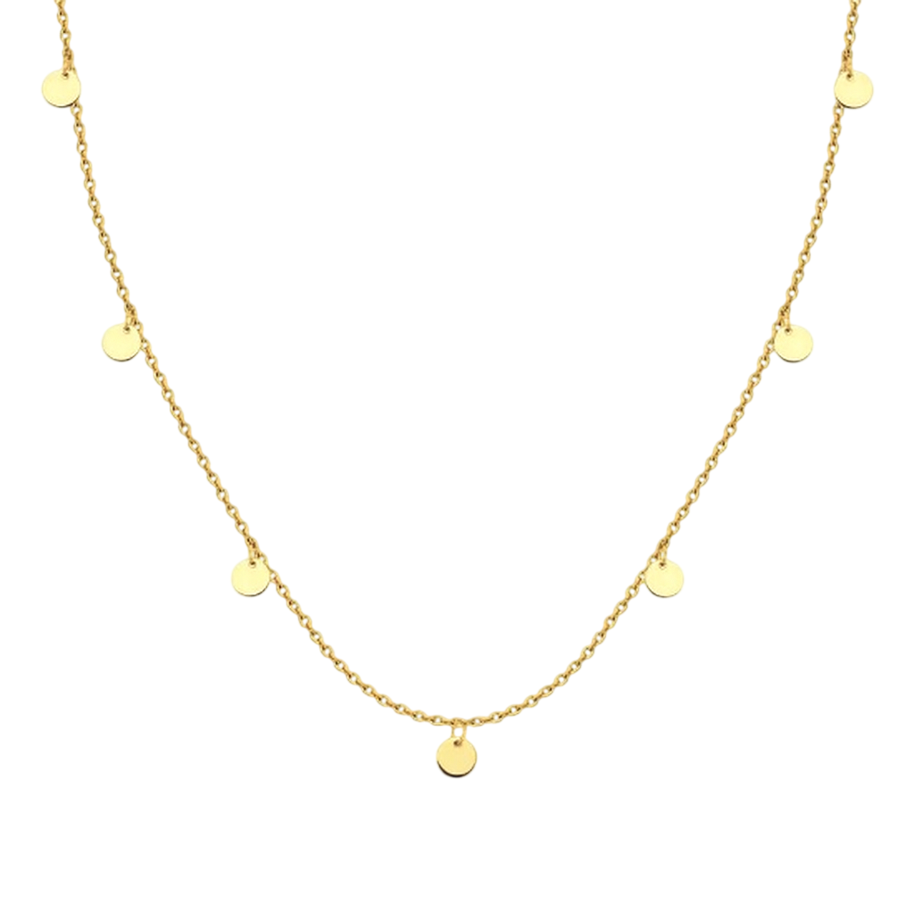 Золоте кольє Монетки – стильна прикраса з легким грайливим характером. Короткий, але виразний дизайн робить кольє універсальним акцентом як для повсякденних образів, так і для особливих випадків. Прикраса красиво підкреслює лінію шиї та легко поєднується з іншими ланцюжками, створюючи модний багатошаровий ефект.